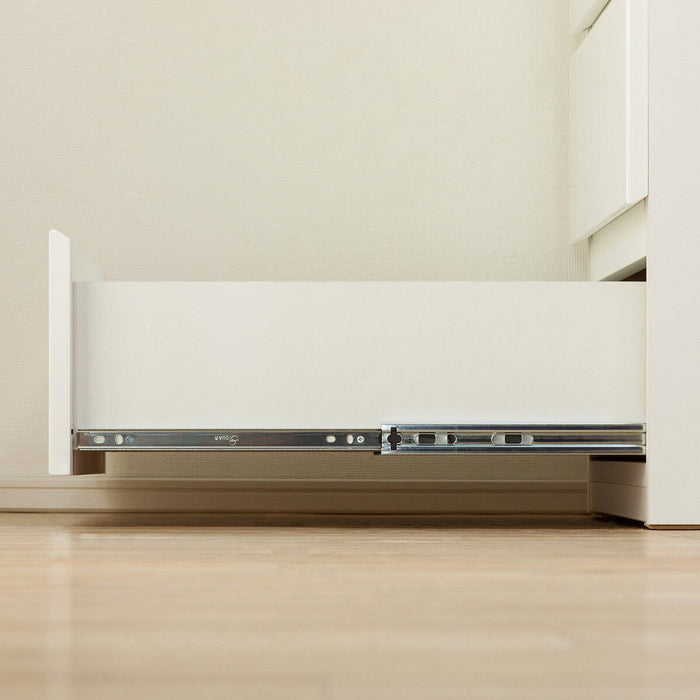 引出しは全段レールつき。さらに最下段はフルオープンスライドレールを採用し、奥まで引き出せて便利です。